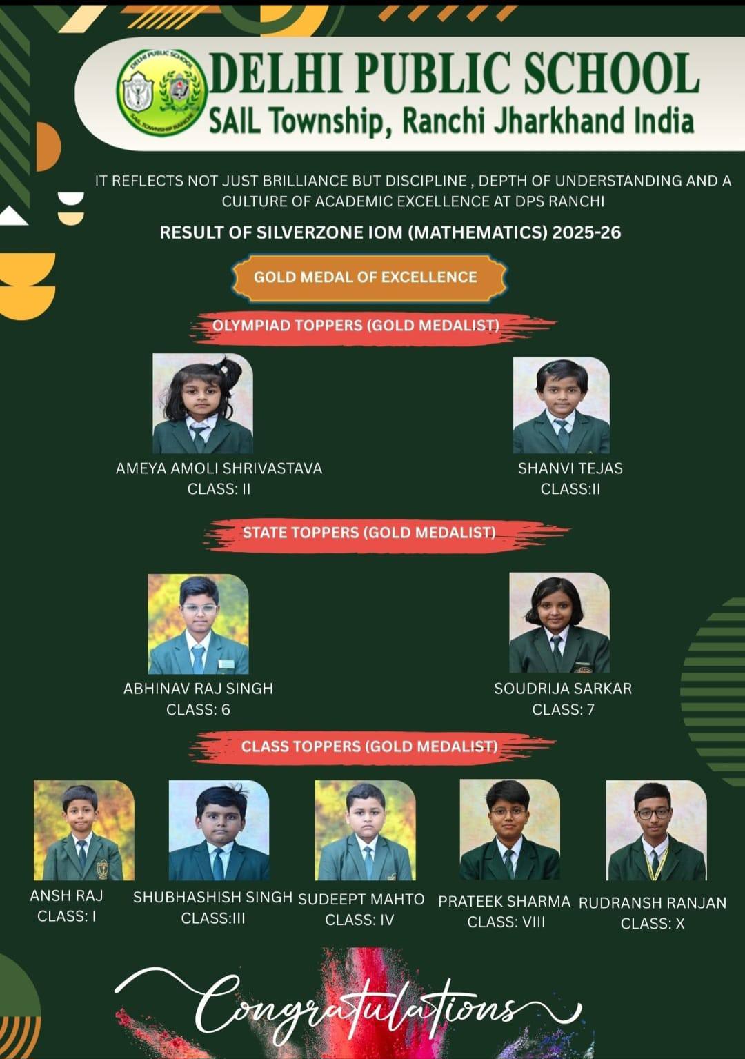 Along with him, several other students from DPS Ranchi also qualified in this esteemed Olympiad, showcasing the school’s strong foundation in mathematical learning. The qualifiers include, Swaransh Kumar, Ishan Kumar Jha, Anaw Raj, Advaith Arun, Ahaan Thakur, Abhigya Ranjan, Pawni Raj, Tanisha Raj, and Matsya Thakur.