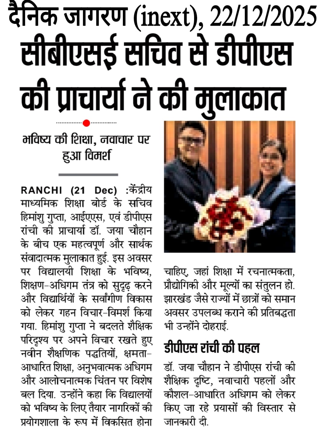 At DPS Ranchi, we have always believed that education is not merely about academics, but about building character, fostering creativity, and cultivating compassion. As we move forward together, I assure you that I will work hand-in-hand with our dedicated teachers, supportive parents, and our brilliant students to uphold the school’s legacy of excellence while also embracing new opportunities for growth and innovation.