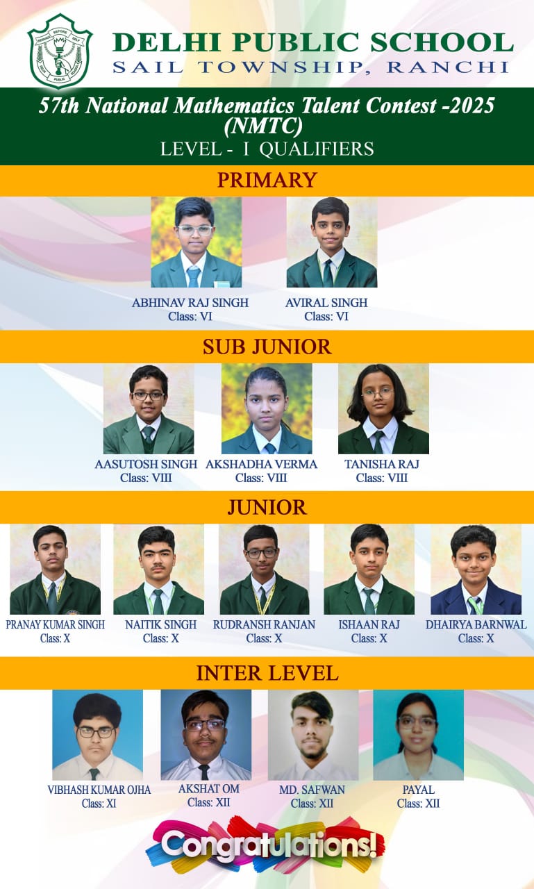 Delhi Public School, Ranchi has once again proved its academic excellence as 14 students of the school qualified Level 01 of the prestigious 57th National Mathematics Talent Contest (NMTC), organised by the Association of Mathematics Teachers of India (AMTI), and have been selected for Level 02 of this highly competitive examination.