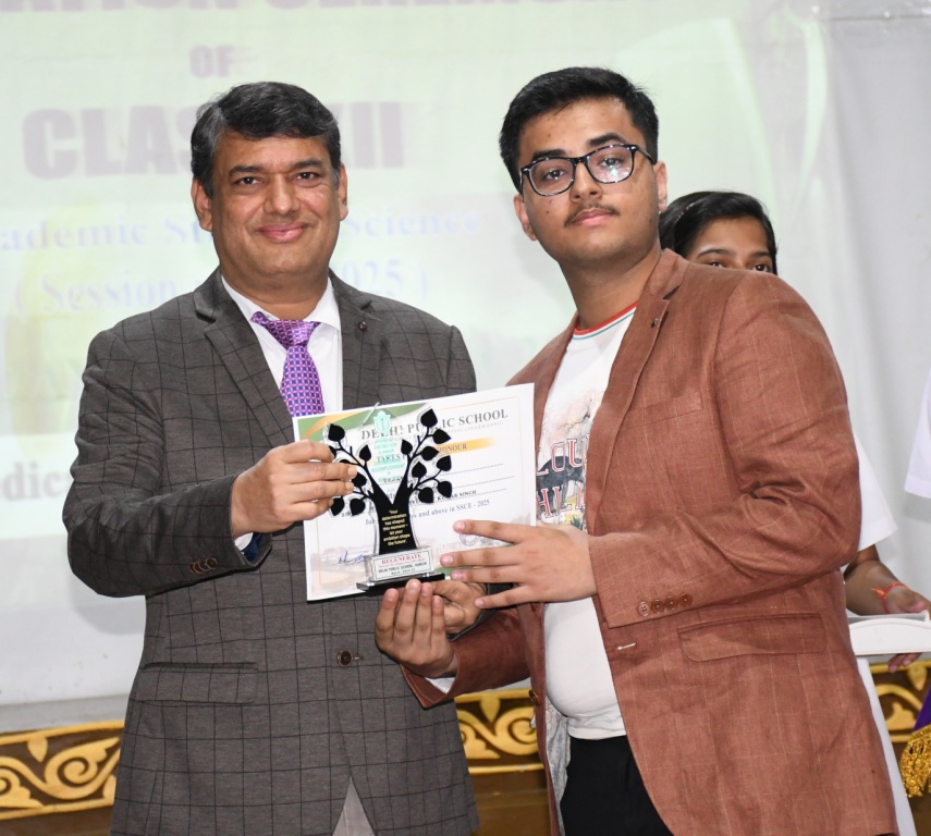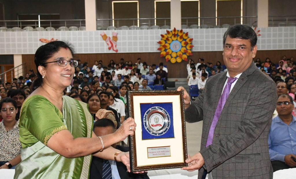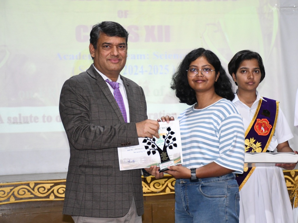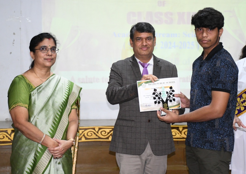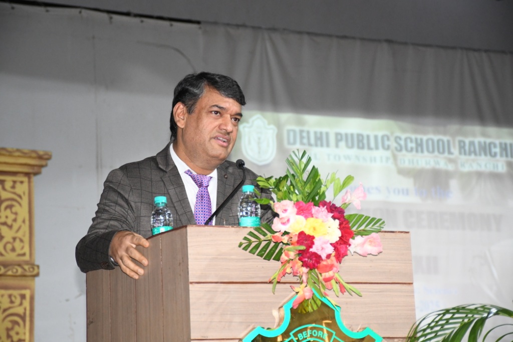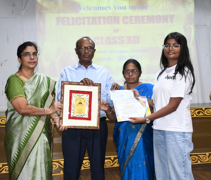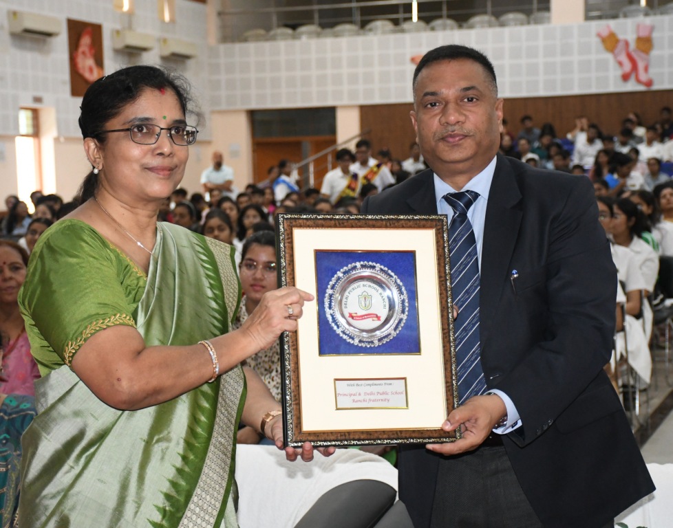 Description: In a grand display of academic pride and achievement, Delhi Public School, Ranchi, hosted an inspiring Felicitation Ceremony at the Vivekananda Auditorium to honour the stellar performance of its Class XII Science stream students in the CBSE Senior School Certificate Examination (SSCE) 2025. The celebration was graced by Dr. Manish Ranjan (IAS), Director General, Shri Krishna Institute of Public Administration, Ranchi who presided as the Chief Guest, and Mr. Prabhat Kumar, (IPS), IG, Special Branch, Jharkhand, who attended as the Guest of Honour. Their presence infused the event with gravitas and encouragement for the young achievers. The programme commenced with a melodious Welcome Song presented by the school choir, which filled the auditorium with energy and emotion. This was followed by the formal welcome — a sapling and memento presentation to the esteemed guests by the Honourable Principal, Dr. Jaya Chauhan, marking the ceremonial opening of the event.