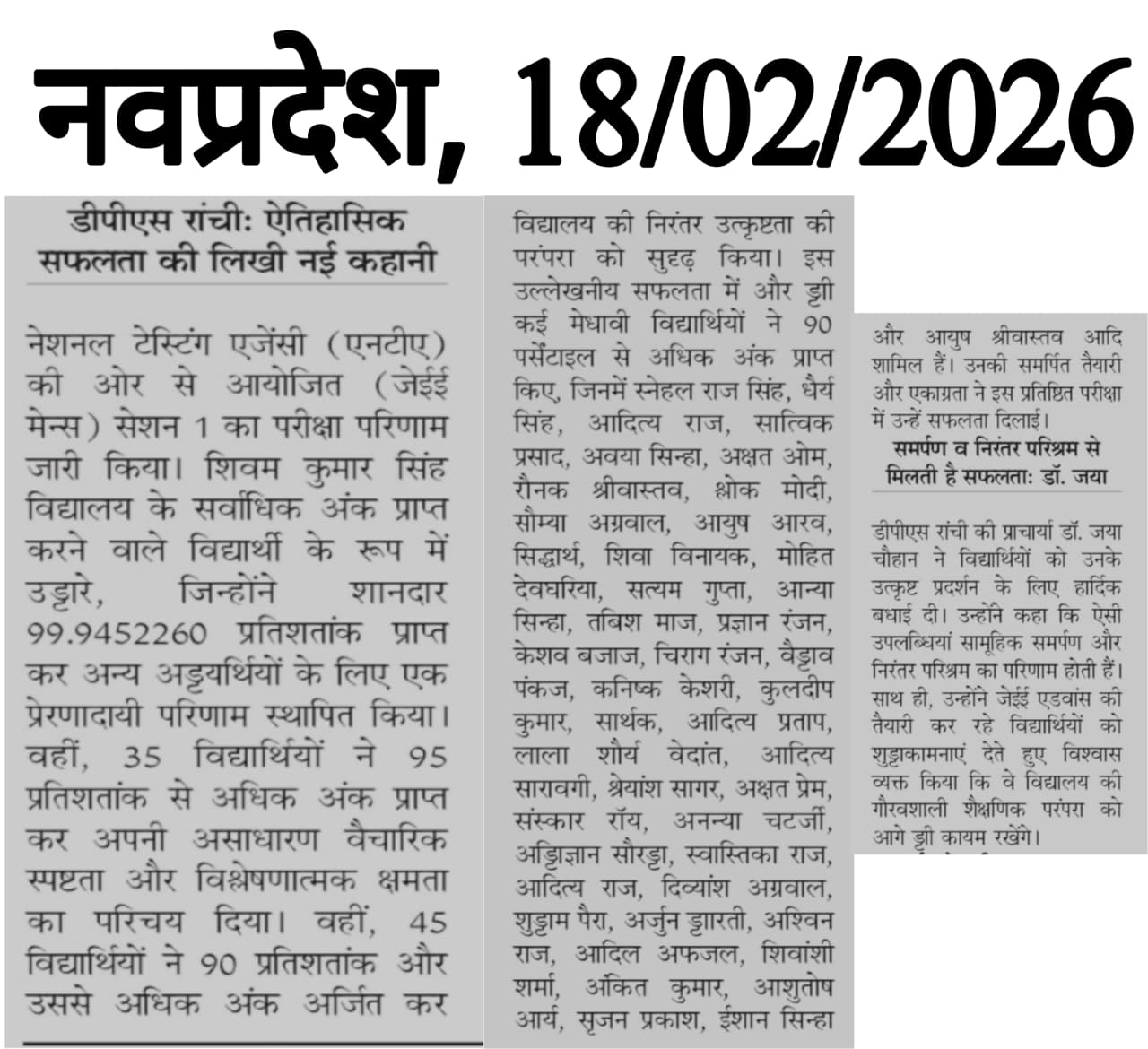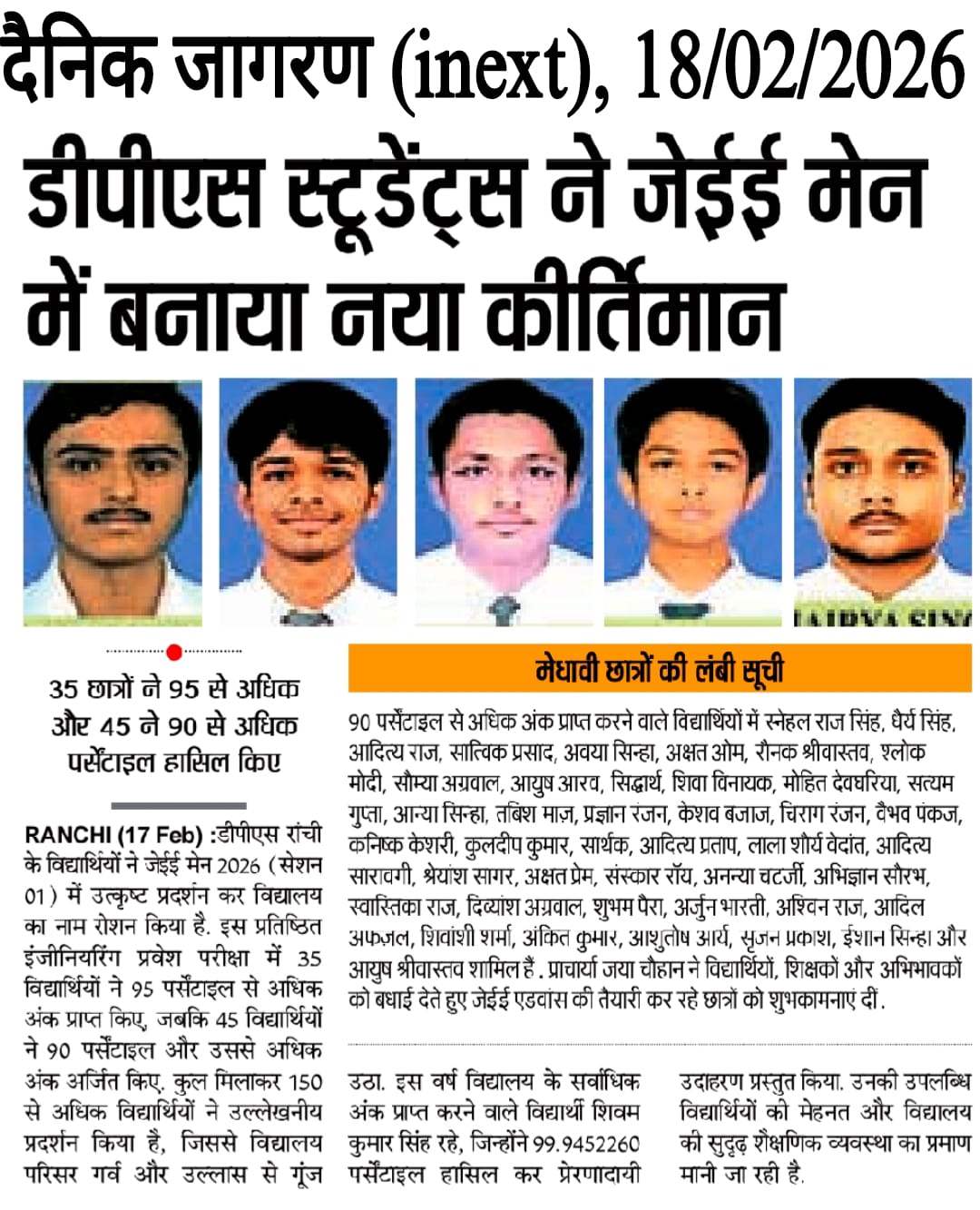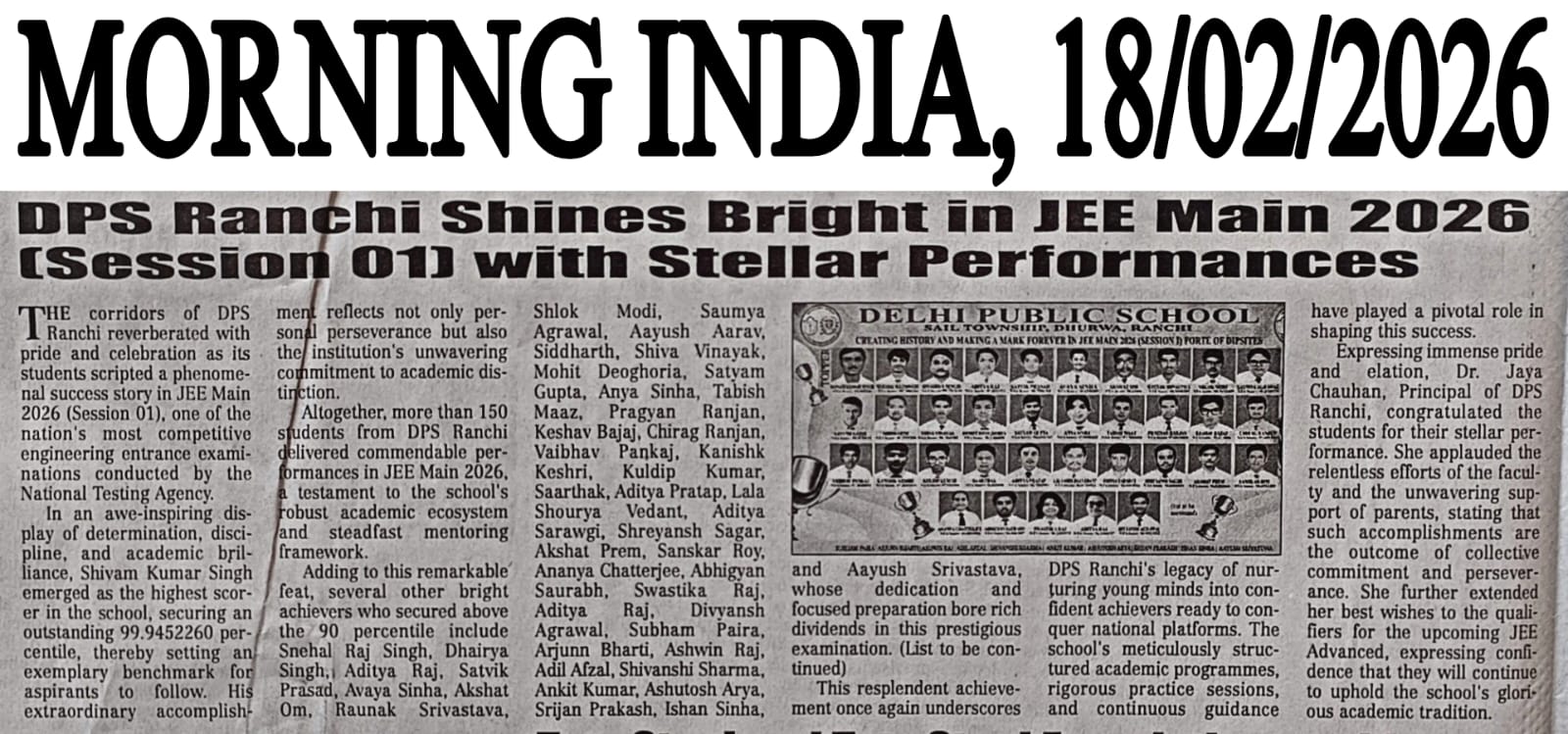 DPS Ranchi Shines Bright in JEE Main 2026 (Session 01) with Stellar Performances