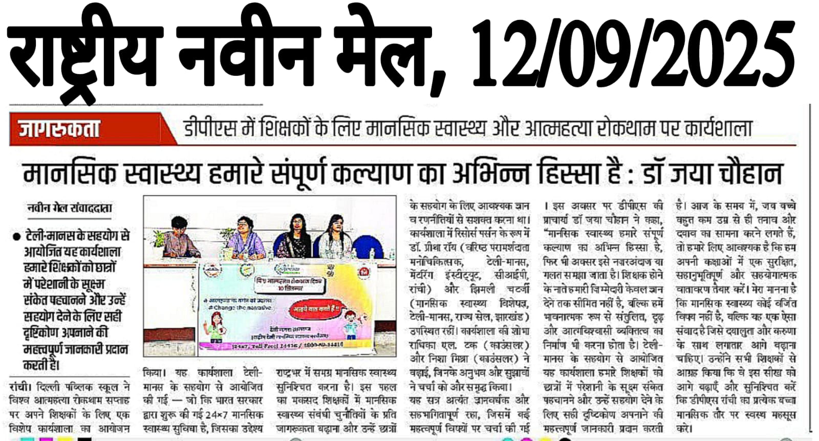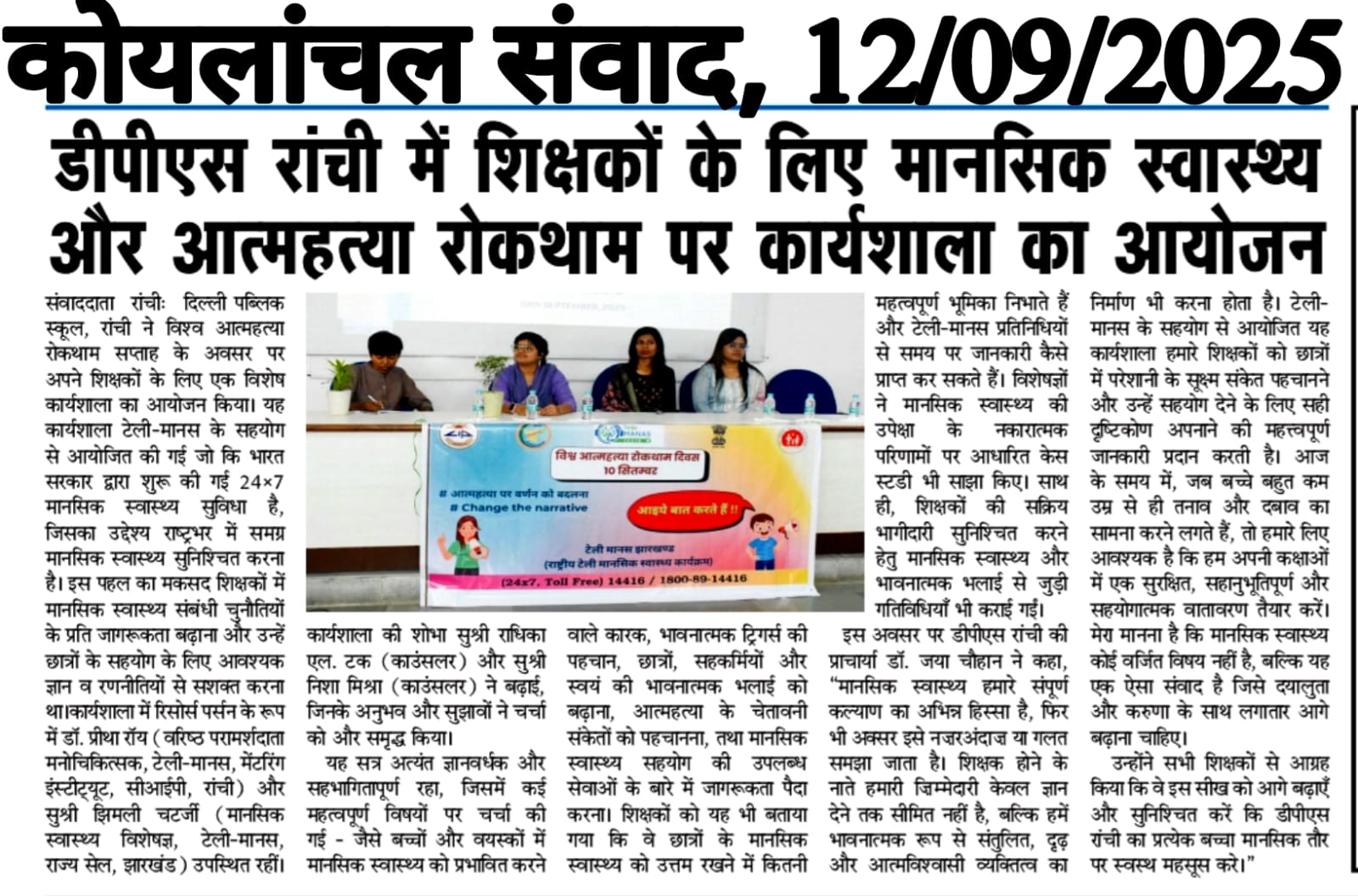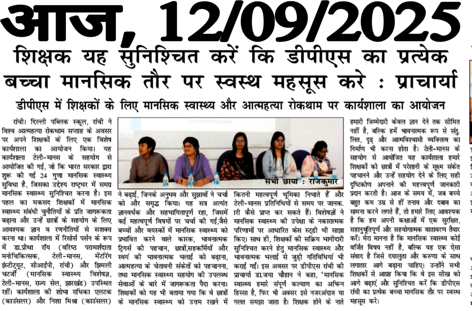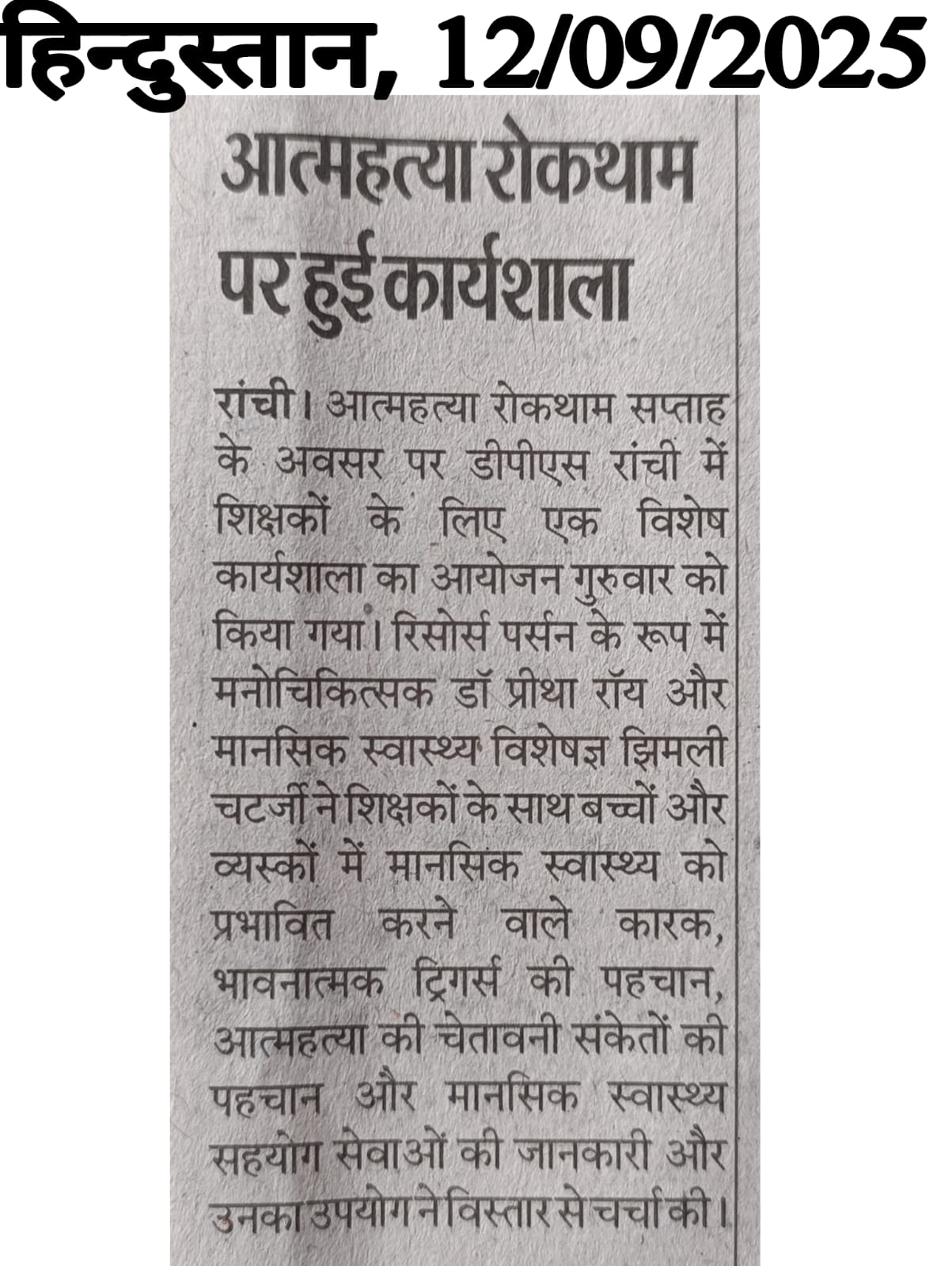 DPS Ranchi organised Workshop for Teachers on Mental Health and Suicide Prevention