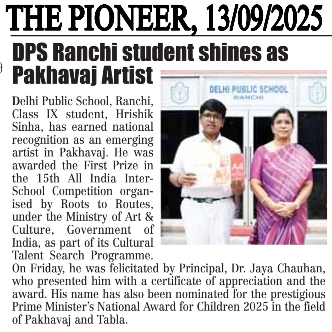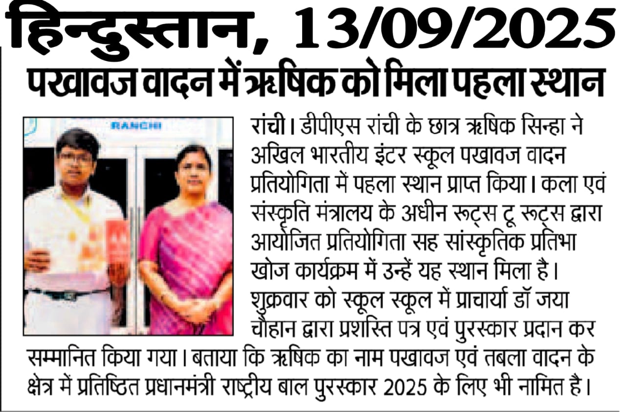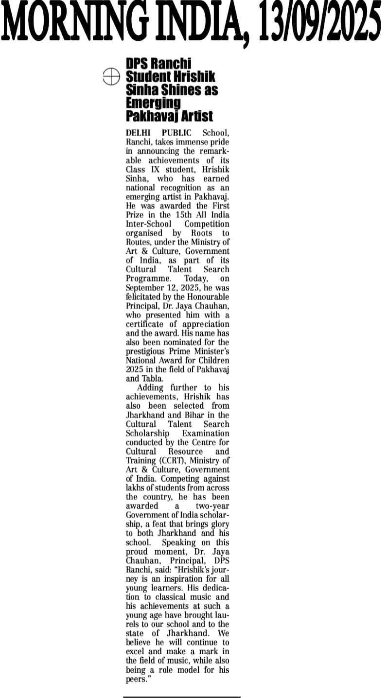 DPS Ranchi Student Hrishik Sinha Shines as Emerging Pakhavaj Artist